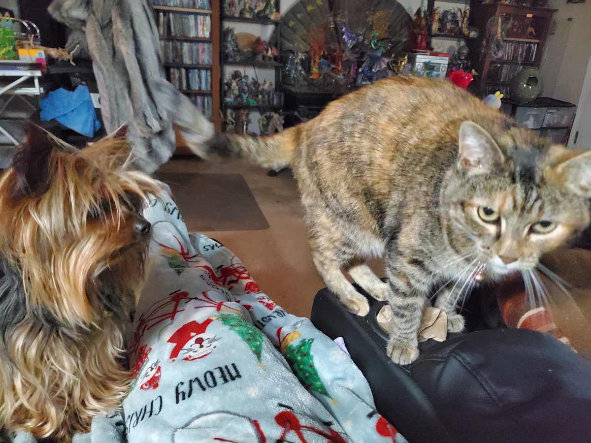 Tigra darted through it like a furry little bullet, all legs and confidence. Sammy wasn’t far behind, yipping with excitement, his ears flapping like tiny flags as he barreled through after her. The two of them treated the door like it was the gateway to Narnia—or maybe just the front yard, which was almost the same thing in their eyes.