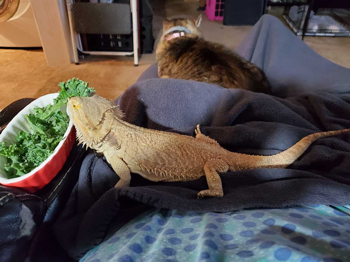 Wick was the first to notice. He hopped up onto the back of the couch, eyes narrowing, tail flicking, ears pitched forward. To him, Izzy’s new glass castle was the greatest TV channel ever invented. She basked, she scrambled up her branch, she flicked her tongue at crickets—and Wick watched every second like a kid glued to Saturday morning cartoons.